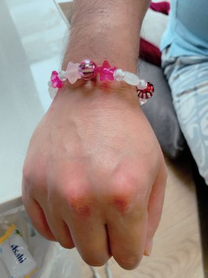 訪問看護で 週二回ほど 訪問してる40代前半の利用者様。2年前に作業療法の代わりに 一緒に作ったブレスレット。今でも大切にしてくれてます。